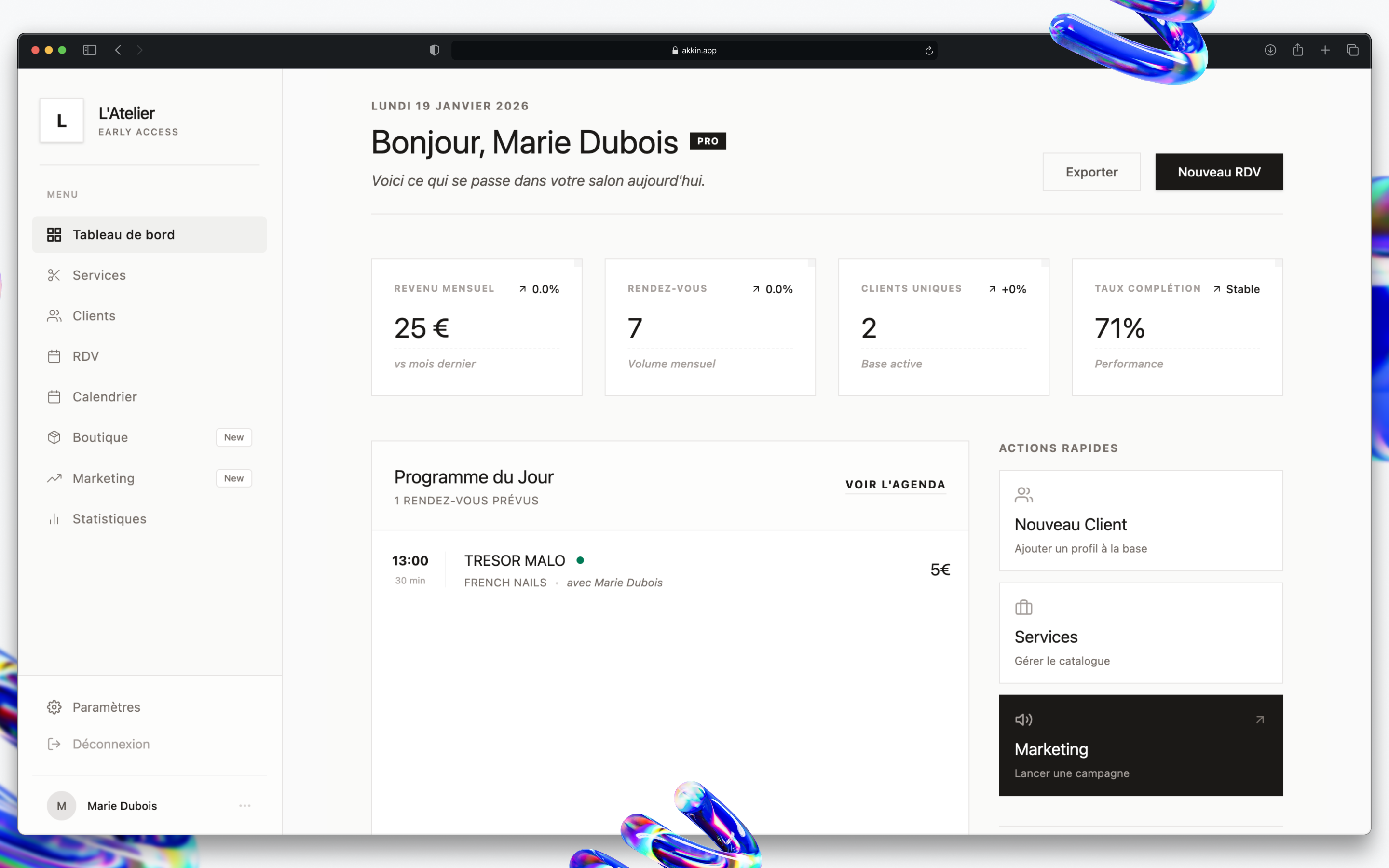 "Depuis que j'ai Akkin, je ne gère plus les messages le soir. Tout est auto, mes clientes adorent le rappel SMS."